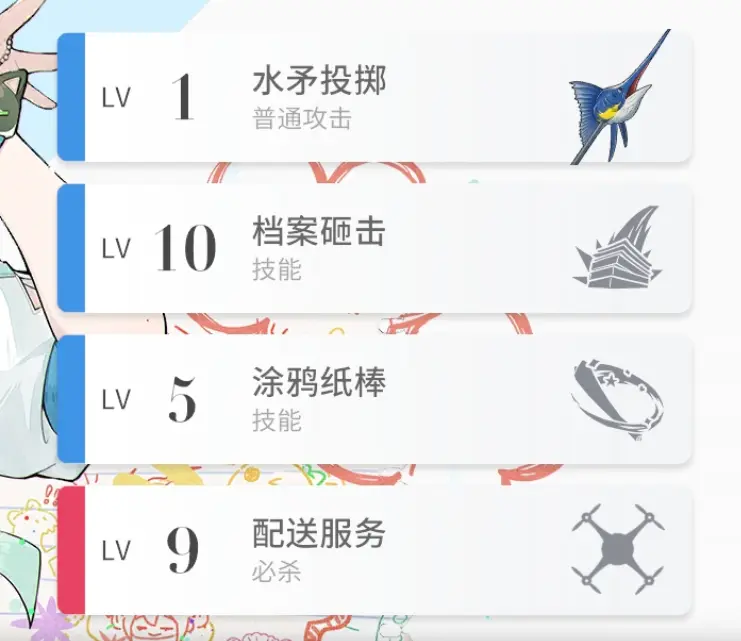 (特殊效果——无人机五星效果:黄色星星回复40点必杀技能量,蓝色书本恢复AP值(数值未知),红色爱心回复20必杀技能量的同时还提升几秒攻击力(大概10%)。