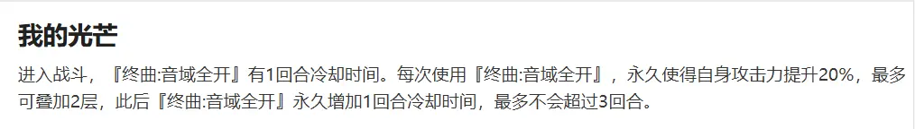 后续回合:按照之前的顺序以此类推,当无法释放3技能终曲:音域全开时使用2技能激情奏鸣为队伍补充伤害