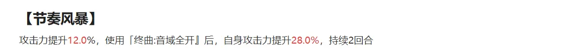 解析:很基本的数值提升,附带词条能够提升自身攻击力。在释放三技能后,能够进一步的提升攻击力。(倘若攻击力未达到增益技能【即兴演奏】满收益所需的要求时,则可通过该攻击力提升效果来达成)