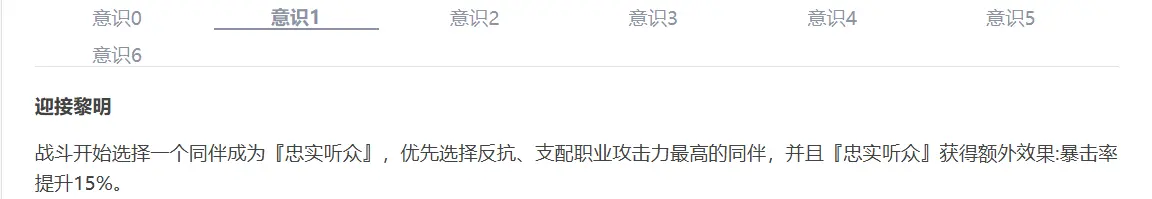 质变意识,和意识一给予的效果相呼应,不再需要开局第一回合释放一技能,可以直接选择三技能,并且还能够提升所有怪盗的伤害。