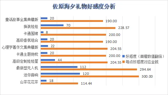 从表格中可以看出,其偏好礼物好感度总体加值较低,最好配合协同等级解锁的其他礼物一起赠送,日常多赠送9级协同能力解锁的“高级精油组合”、“栗子蛋糕”,以及本身偏好的“高级定制娃娃屋”,适当配以“最新型无人机”与“迷你音响”这类昂贵礼物快速提升等级。制作礼物“山茶花花茶”好感度数值一般,首赠后建议以其他礼物为主。