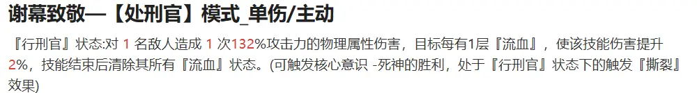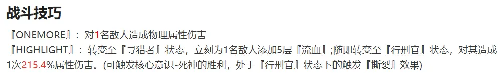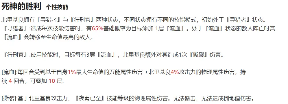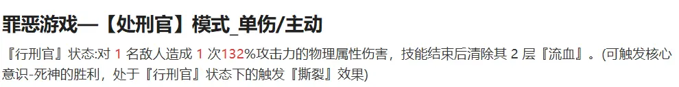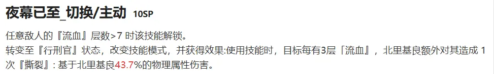 切换战斗形态的同时提升[处刑官]状态下所能造成的额外伤害,但由于北里基良在低意识的情况下直伤能力并不突出,因此该技能仅适合高意识等级的北里基良使用。技能优先度较低