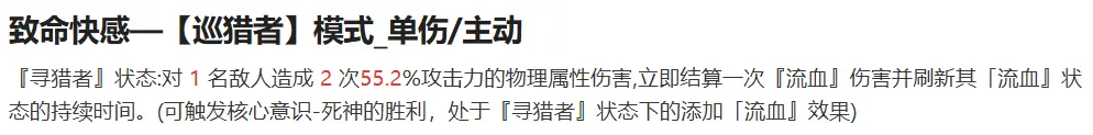 较弱意识:仅仅加速了北里基良的启动速度,使其在第一回合便能通过[寻猎者]状态下的二技能致命快感快速施加“流血”层数和造成不错的伤害。对角色的提升效果一般