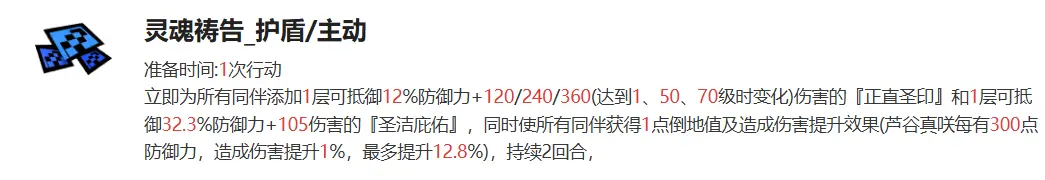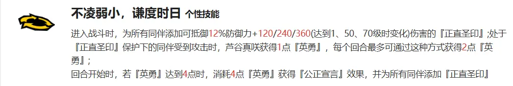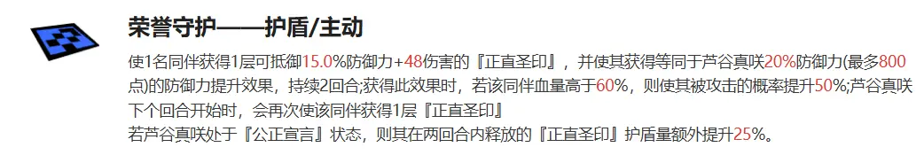 【正直圣印】可以给予所有同伴3回合的护盾(进入战斗时将自动添加一次),配合其潜能可以为护盾下的队友提供额外防御力、效果抵抗的提升。