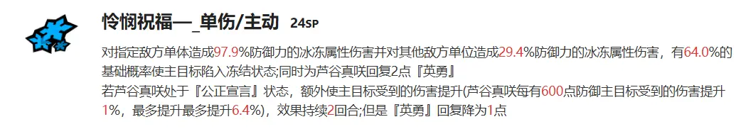 怜悯祝福虽为单伤,实为AOE技能,该技能有几率使主目标陷入冻结状态,同时快速回复【英勇】点数;处于【公正宣言】状态时,还可使主目标受到的伤害提升。但芦谷真咲作为防卫型辅助,主要职能是为团队提供护盾和其他效果状态,因此该技能使用率较低,基本可以忽略。