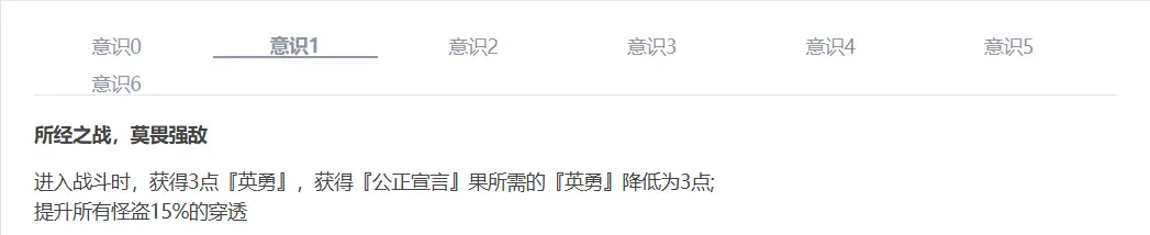 进入战斗时即可获得【公正宣言】效果、降低了【公正宣言】所需的【英勇】点数,且最重要的是提升了15%穿透效果。考虑到喜多川祐介“雕琢”潜能自带的20%穿透、意识6提供的30%额外穿透,加上宫下美波溢出治疗时提供的20%穿透(需意识等级1)以及真咲学长意识1提供的15%穿透,配上喜多川祐介启示副词条适当的穿透提升,将达到100%穿透,输出效果非常可观。