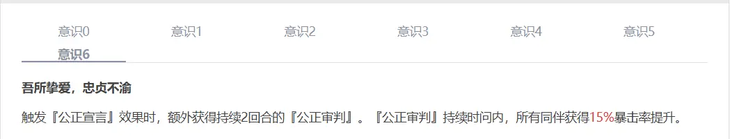 该意识是提升暴击率的关键意识,触发【公正宣言】效果时,获得2回合15%暴击率效果,几乎可以做到喜多川祐介刀刀烈火了! 氪佬玩家必备!
