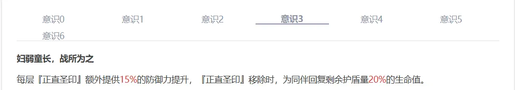 意识3赋予【正直圣印】额外的防御力提升,并在一定程度上赋予了芦谷真咲回复能力,考虑他高频释放护盾的技能,拥有着极为不错的治疗效果。