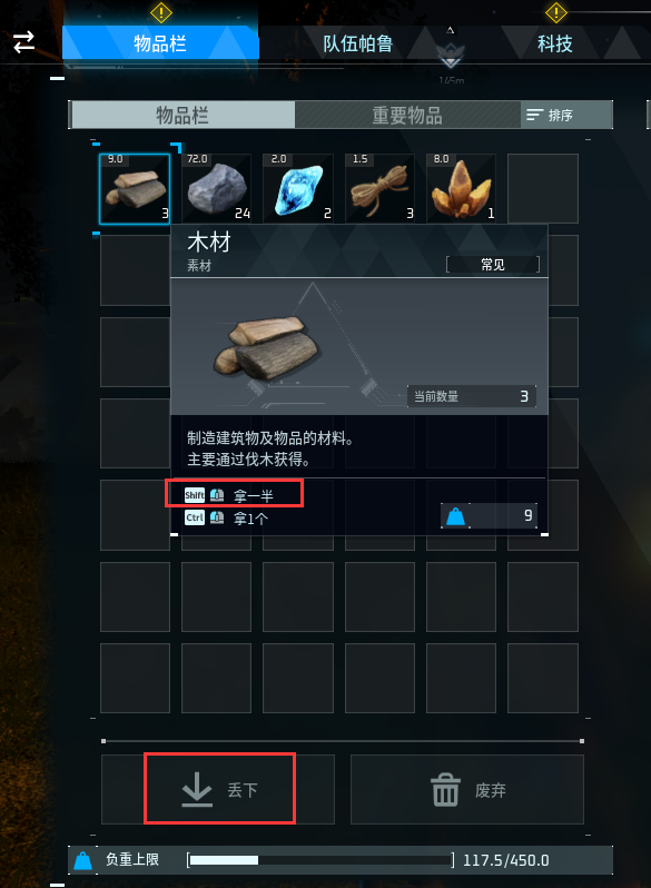 按tab键打开物品栏,选择暂时不需要的物品,点击【丢下】,丢下后物品会放在原地,可以随时回来捡起