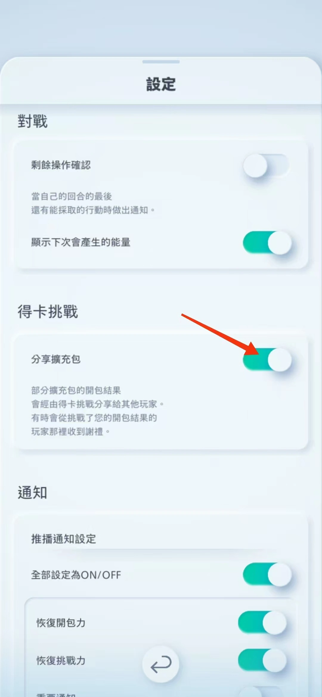 答案是点击主菜单右下的三条横杠,进入其他-设定,关闭分享挑战包,之后你的好友就不会在得卡挑战中发现你的包了。