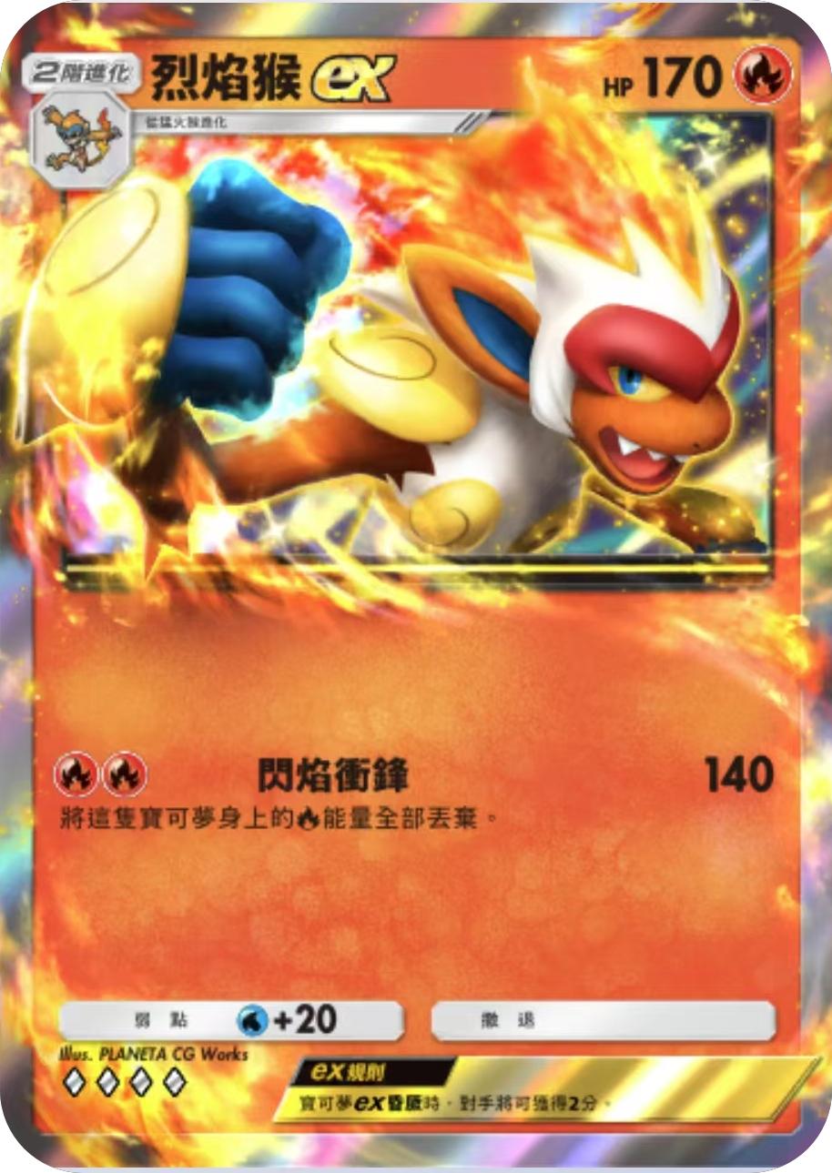 相比喷火龙ex,烈焰猴ex的所需能量更低,2能即可打出140,但是会清空能量又导致存不起来,目前环境发挥不如喷火龙。