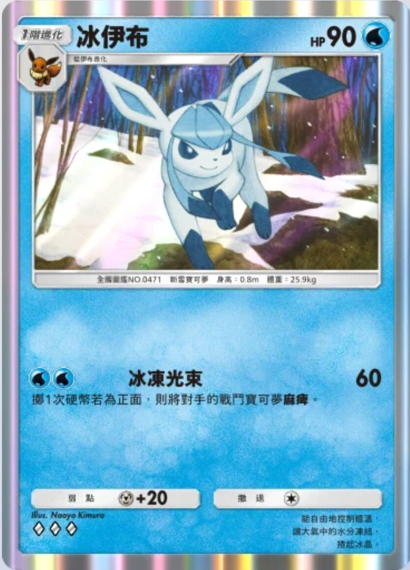 冰伊布 基础信息 冰伊布种类新雪宝可梦宝可梦1阶进化HP90属性撤退弱点+20系列A绘师Naoyo Kimura身高0.8m体重25.9kgA2 046/155卡牌简介能自由地控制体温,让大气中的水分冻结,卷起冰晶。 技能 冰冻光束伤害:60掷1次硬币若为正面,则将对手的战斗宝可梦麻痹。