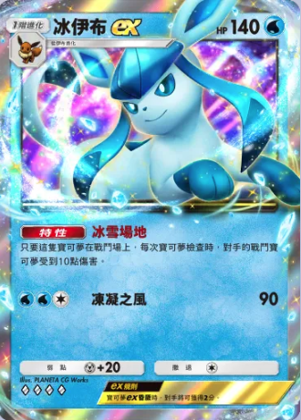 冰伊布ex 基础信息 冰伊布ex宝可梦1阶进化HP140属性撤退弱点 +20系列A绘师PLANETA CG WorksA2a 022/75 技能 冻凝之风伤害:90 特性 冰雪场地只要这只宝可梦在战斗场上,每次宝可梦检查时,对手的战斗宝可梦受到10点伤害。