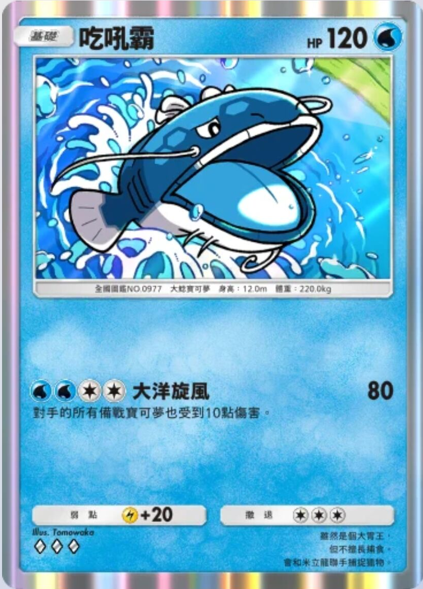 吃吼霸 基础信息 吃吼霸种类大鲶宝可梦宝可梦基础HP120属性撤退弱点 +20系列A绘师Tomowaka身高12.0m体重220.0kgA2b 20/72卡牌简介虽然是个大胃王,但不擅长捕食。会和米立龙联手捕捉猎物。 技能 大洋旋风伤害:80对手的所有备战宝可梦也受到10点伤害。