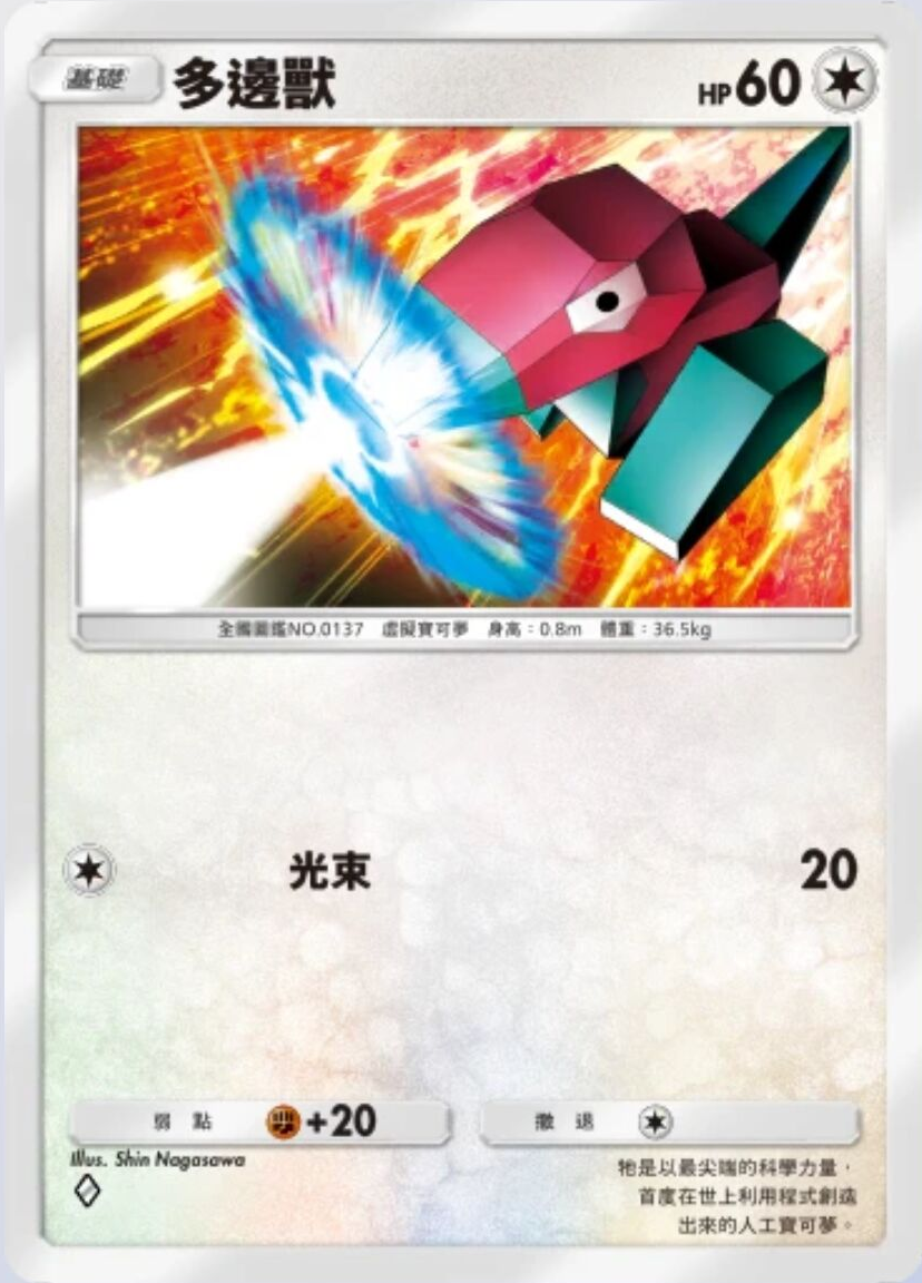 多边兽 基础信息 多边兽种类虚拟宝可梦宝可梦基础HP60属性撤退弱点+20系列A绘师Shin Nagasawa身高0.8m体重36.5kgA2 127/155卡牌简介它是以最尖端的科学力量,首度在世上利用程序创造出来的人工宝可梦。 技能 光束伤害:20