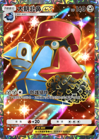 大朝北鼻ex 基础信息 大朝北鼻ex宝可梦1阶进化HP160属性撤退弱点 +20系列A绘师PLANETA TsujiA2a 085/75 技能 防护组件伤害:90在下个对手的回合,这只宝可梦受到招式的伤害-20点。
