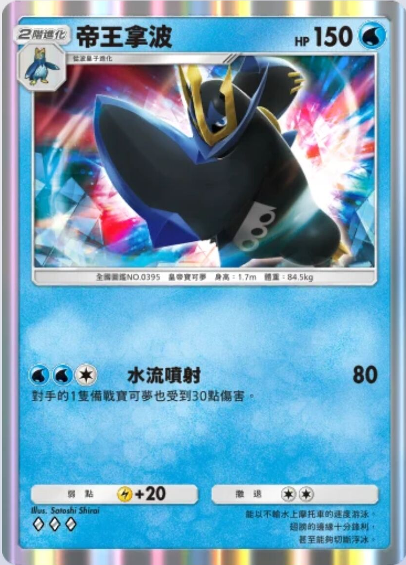 帝王拿波 基础信息 帝王拿波种类皇帝宝可梦宝可梦2阶进化HP150属性撤退弱点+20系列A绘师Satoshi Shirai身高1.7m体重84.5kgA2 037/155卡牌简介能以不输水上摩托车的速度游泳,翅膀的编译十分锋利,甚至能切断浮冰。 技能 水流喷射伤害:80对手的1只备战宝可梦也收到30点伤害。