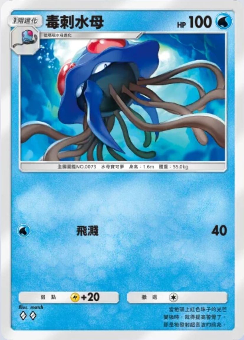 毒刺水母 基础信息 毒刺水母种类水母宝可梦宝可梦1阶进化HP100属性撤退弱点 +20系列A绘师match身高1.6m体重55.0kgA2b 15/72卡牌简介当它头上红色珠子的光芒变强时,就得提高警觉了。那是它发射超音波的前兆。 技能 飞溅伤害:40