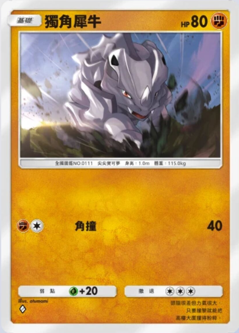 独角犀牛 基础信息 独角犀牛种类尖尖宝可梦宝可梦基础HP80属性撤退弱点 +20系列A绘师otumami身高1.0m体重115.0kgA2 080/155卡牌简介头脑很差但力气很大,只要撞击就能把高楼大厦撞得粉碎。 技能 角撞伤害:40