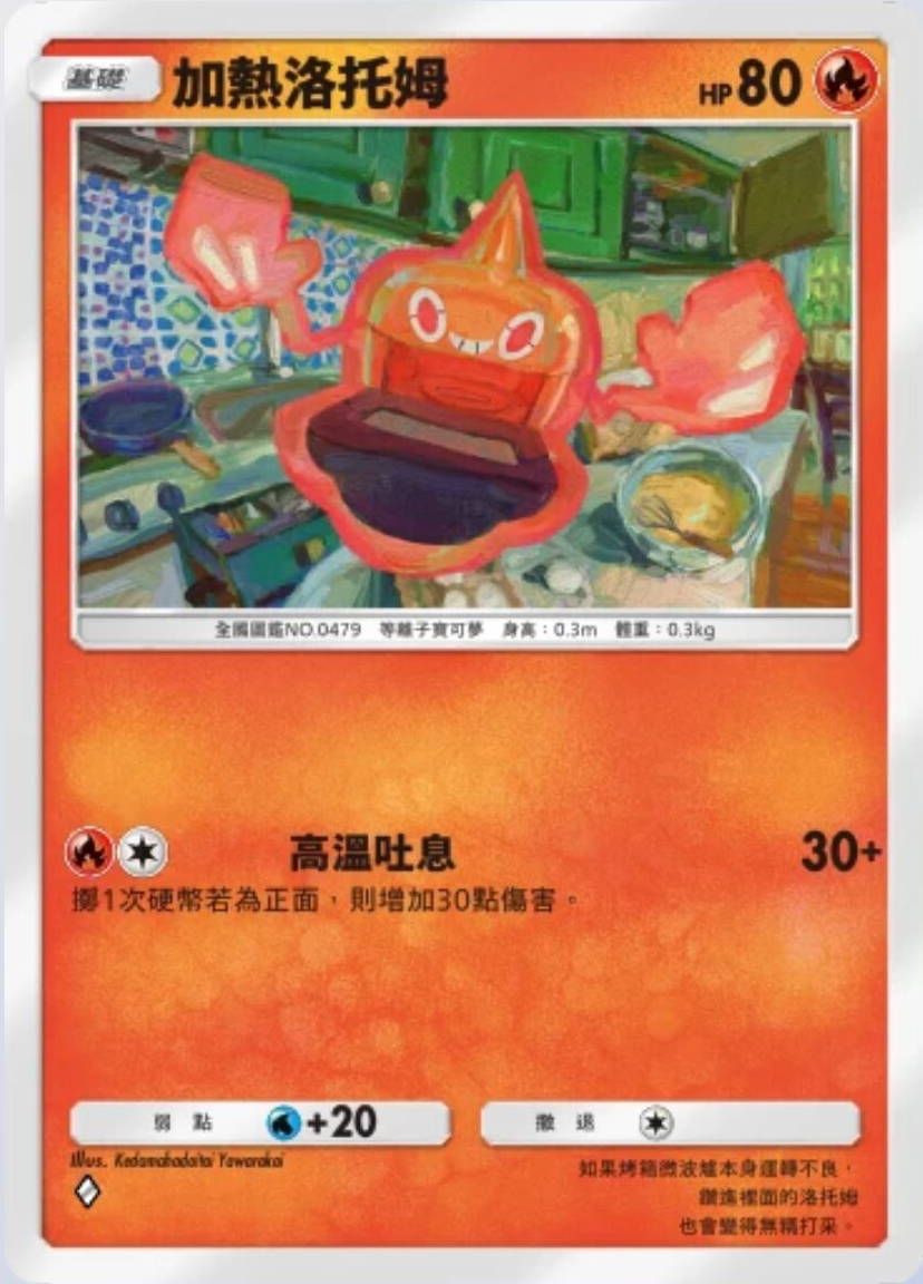 加热洛托姆 基础信息 加热洛托姆种类等离子宝可梦宝可梦基础HP80属性撤退弱点+20系列A绘师Kedamahadaitai Yawarakai身高0.3m体重0.3kgA2 030/155卡牌简介如果烤箱微波炉本身运转不良,钻进里面的洛托姆也会变得无精打采。 技能 高温吐息伤害:30+掷1次硬币若为正面,则增加30点伤害。