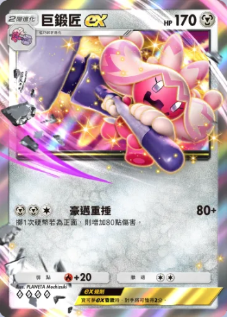 巨锻匠ex 基础信息 巨锻匠ex宝可梦2阶进化HP170属性撤退弱点 +20系列A绘师PLANETA MochizukiA2b 54/72 技能 豪迈重锤伤害:80+掷1次硬币若为正面,则增加80点伤害。