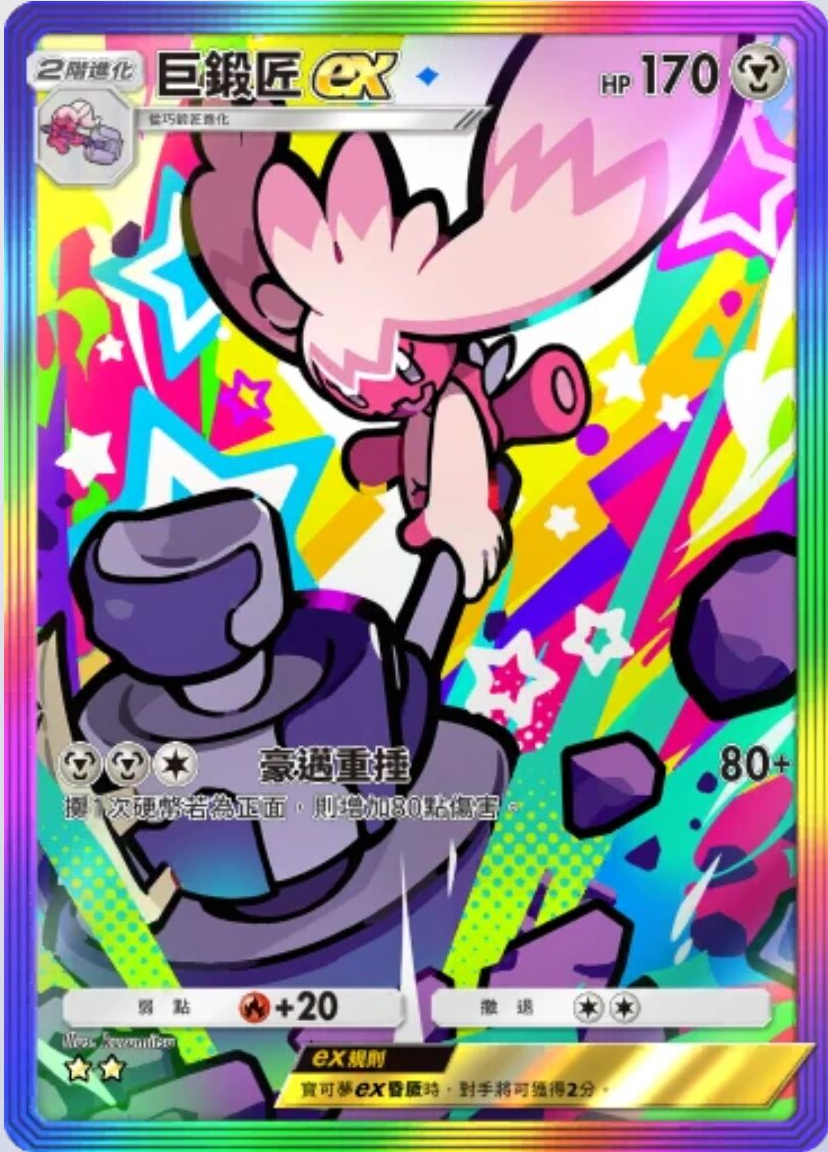 巨锻匠ex 基础信息 巨锻匠ex宝可梦2阶进化HP170属性撤退弱点 +20系列A绘师kurumitsuA2b 94/72 技能 豪迈重锤伤害:80+掷1次硬币若为正面,则增加80点伤害。