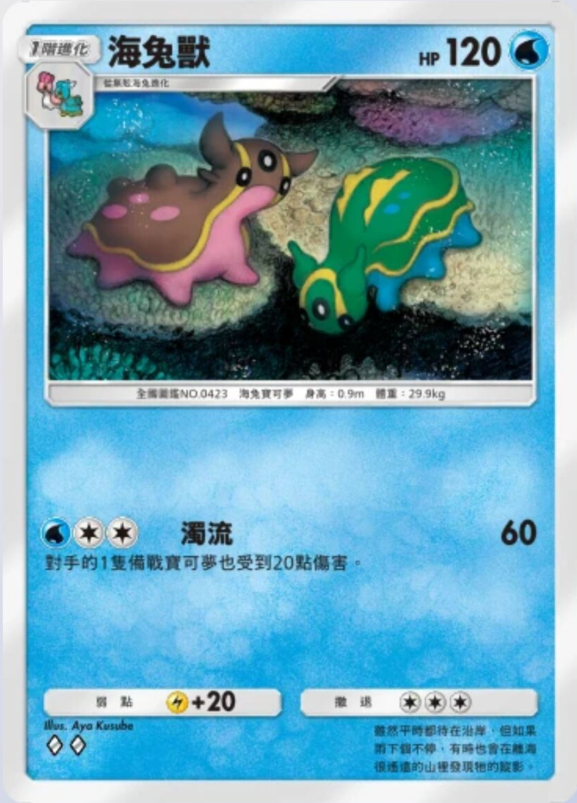 海兔兽 基础信息 海兔兽种类海兔宝可梦宝可梦1阶进化HP120属性撤退弱点+20系列A绘师Aya Kusube身高0.9m体重29.9kgA2 041/155卡牌简介虽然平时都呆在沿岸,但如果雨下个不停,有时也会在离海很遥远的山里发现它的踪影。 技能 浊流伤害:60对手的1只备战宝可梦也收到20点伤害。