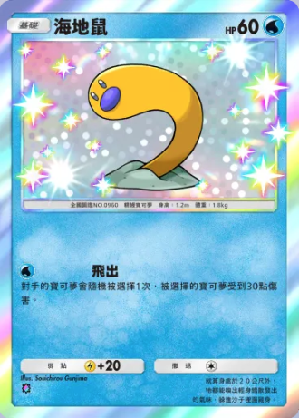 海地鼠 基础信息 海地鼠种类糯鳗宝可梦宝可梦基础HP60属性撤退弱点 +20系列A绘师Souichirou Gunjima身高1.2m体重1.8kgA2b 101/72卡牌简介就算身处于20公尺外,它都能嗅出轻身鳕散发出的气味,躲进沙子里面藏身。 技能 飞出对手的宝可梦会随机被选择1次,被选择的宝可梦受到30点伤害。
