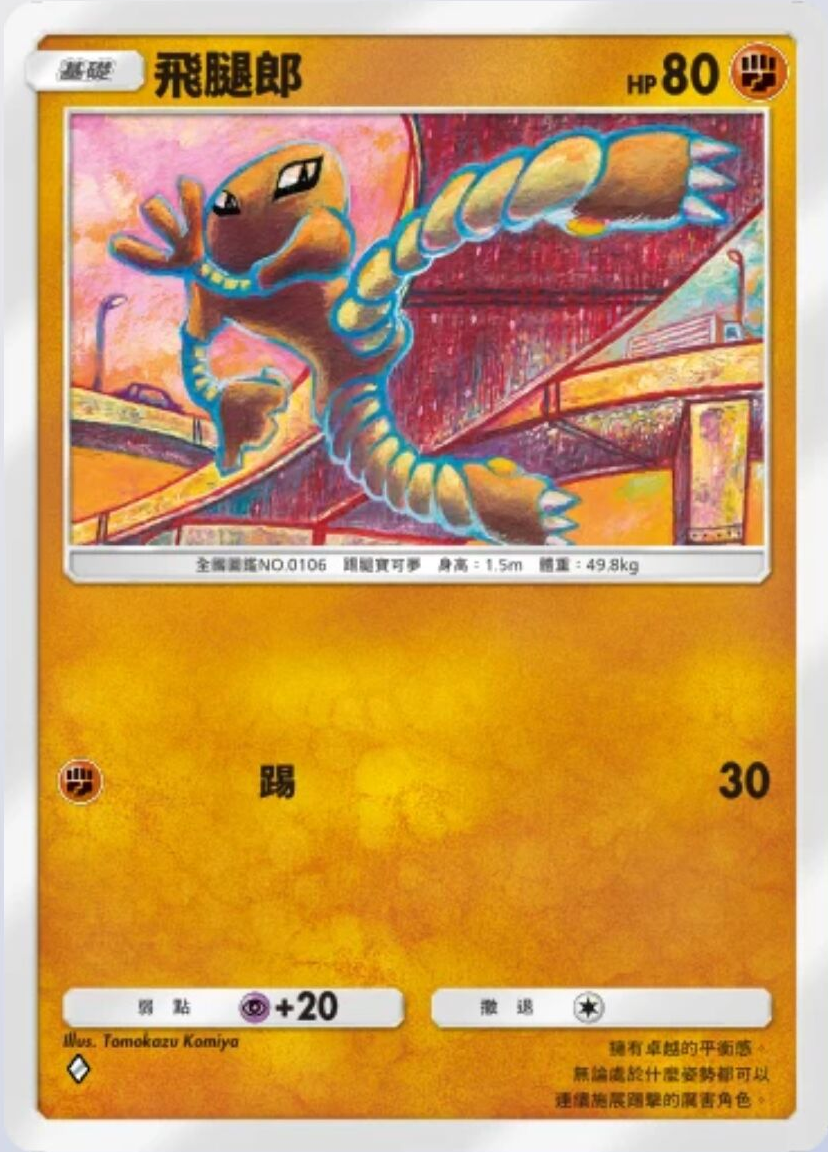 飞腿郎 基础信息 飞腿郎种类踢腿宝可梦宝可梦基础HP80属性撤退弱点+20系列A绘师Tomokazu Komiya身高1.5m体重49.8kgA2b 40/72卡牌简介摊有卓越的平衡感。无论处于什么姿势都可以连施展踢击的厉害角色。 技能 踢伤害:30