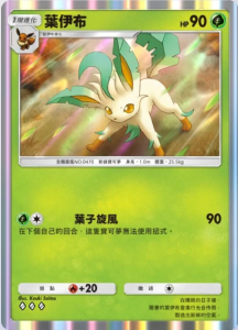 叶伊布 基础信息 叶伊布种类新绿宝可梦宝可梦1阶进化HP90属性撤退弱点+20系列A绘师Kouki Saitou身高1.0m体重25.5kgA2 020/155卡牌简介在晴朗的日子里,睡着的叶伊布会进行光合作用,制造出新鲜的空气。 技能 叶子旋风伤害:90在下个自己的回合,这只宝可梦无法使用招式。