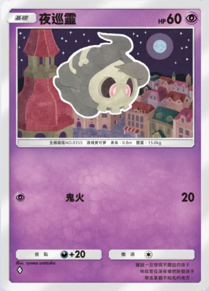 夜巡灵 基础信息 夜巡灵种类渡魂宝可梦宝可梦基础HP60属性撤退弱点 +20系列A绘师ryoma uratsuka身高0.8m体重15.0kgA2 070/155卡牌简介据说一旦发现不听话的孩子,它就会在深夜里把那个孩子带去某个不知名的地方。 技能 鬼火伤害:20