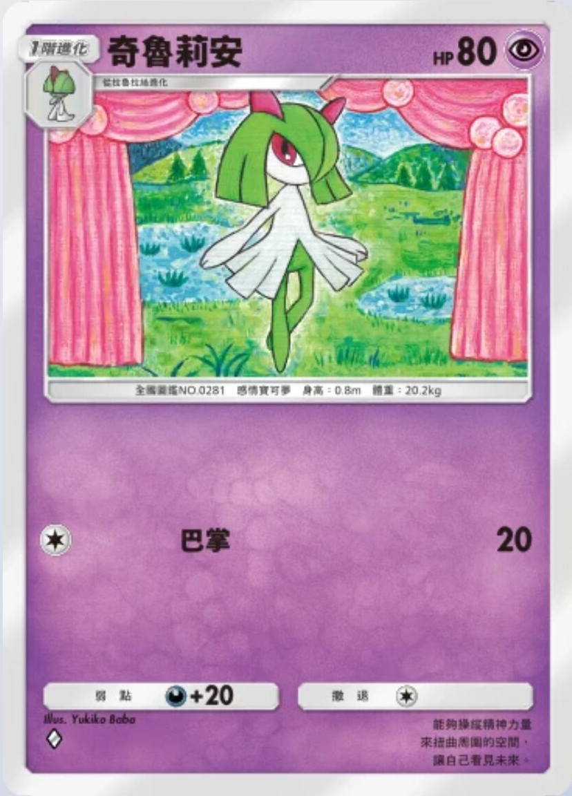 奇鲁莉安 基础信息 奇鲁莉安种类感情宝可梦宝可梦1阶进化HP80属性撤退弱点 +20系列A绘师Yukiko Baba身高0.8m体重20.2kgA2 069/155卡牌简介能够操纵精神力量来扭曲周围的空间,让自己看见未来。 技能 巴掌伤害:20