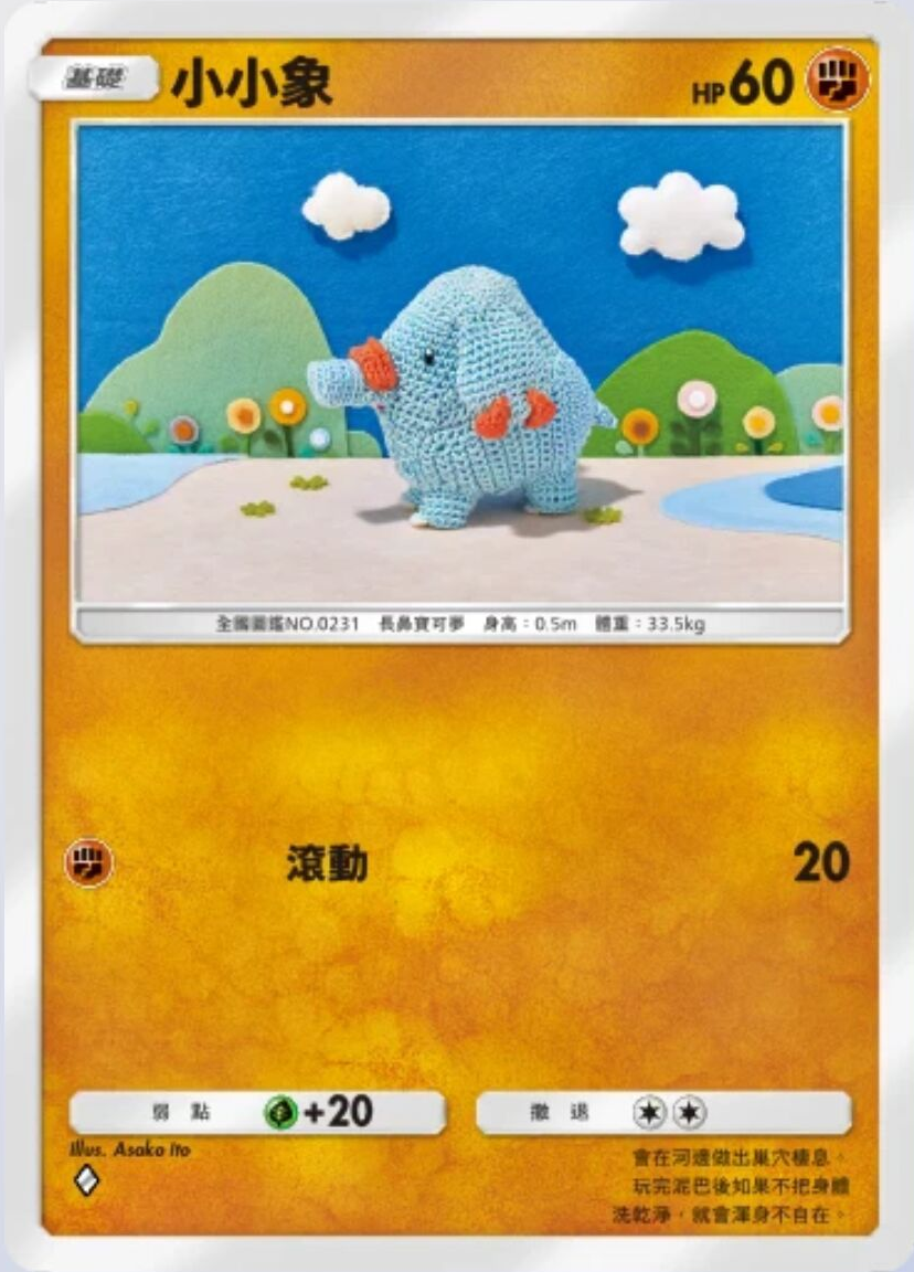小小象 基础信息 小小象种类长鼻宝可梦宝可梦基础HP60属性撤退弱点 +20系列A绘师Asako Ito身高0.5m体重33.5kgA2a 037/75卡牌简介会在河边做出巢穴栖息。玩完泥巴后如果不把身体洗乾淨,就会浑身不自在。 技能 滚动伤害:20