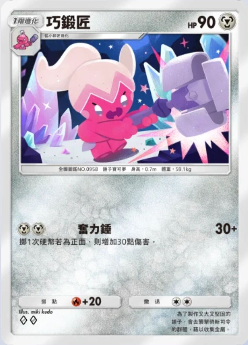 巧锻匠 基础信息 巧锻匠种类锤子宝可梦宝可梦1阶进化HP90属性撤退弱点 +20系列A绘师miki kudo身高0.7m体重59.1kgA2b 53/72卡牌简介为了制作又大又坚固的锤子,会去袭击劈斩司令的群体,借以收集金属。 技能 奋力锤伤害:30+掷1次硬币若为正面,则增加30点伤害。
