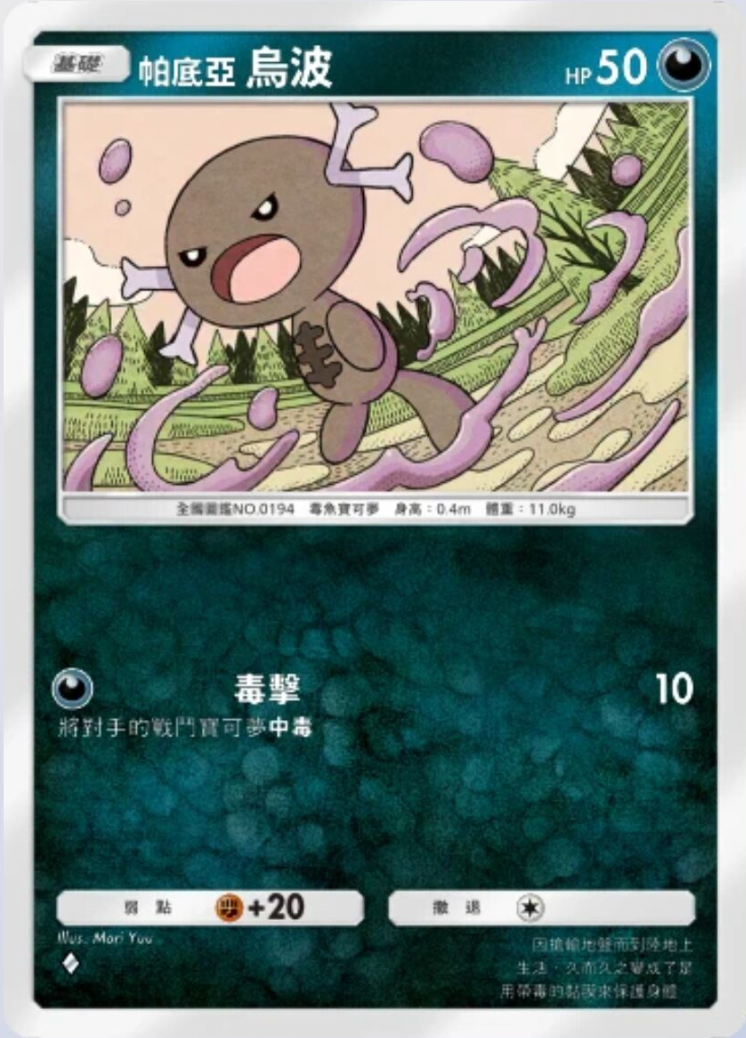 帕底亚乌波 基础信息 帕底亚乌波种类毒鱼宝可梦宝可梦基础HP50属性撤退弱点 +20系列A绘师Mori Yuu身高0.4m体重11.0kgA2b 47/72卡牌简介因抢输地盘而到陆地上生活,久而久之变成了是用带毒的粘膜来保护身体。 技能 毒击伤害:10将对手的战斗宝可梦中毒。