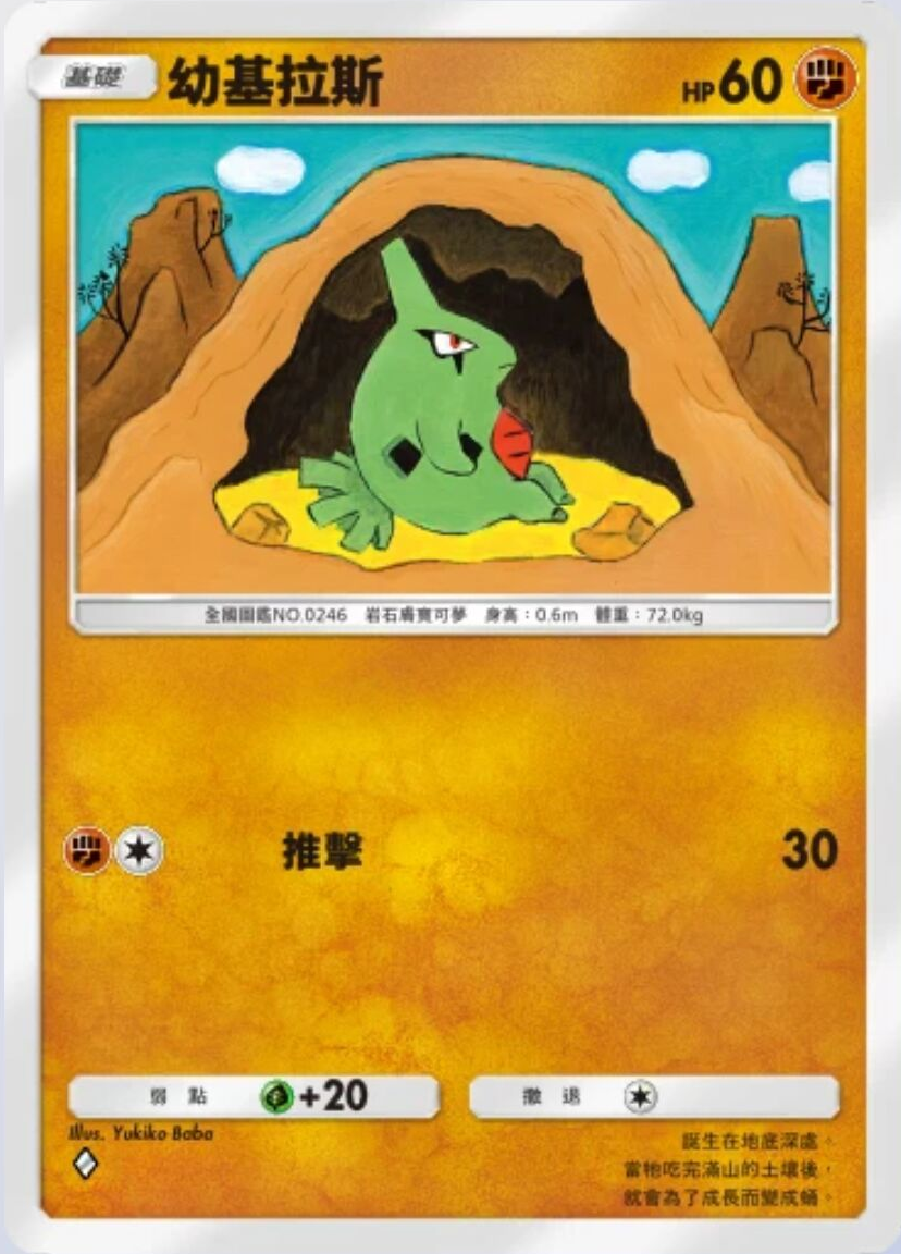 幼基拉斯 基础信息 幼基拉斯种类岩石肤宝可梦宝可梦基础HP60属性撤退弱点 +20系列A绘师Yukiko Baba身高0.6m体重72.0kgA2a 039/75卡牌简介诞生在地底深处。当它吃完满山的土壤后,就会为了成长而变成蛹。 技能 推击伤害:30