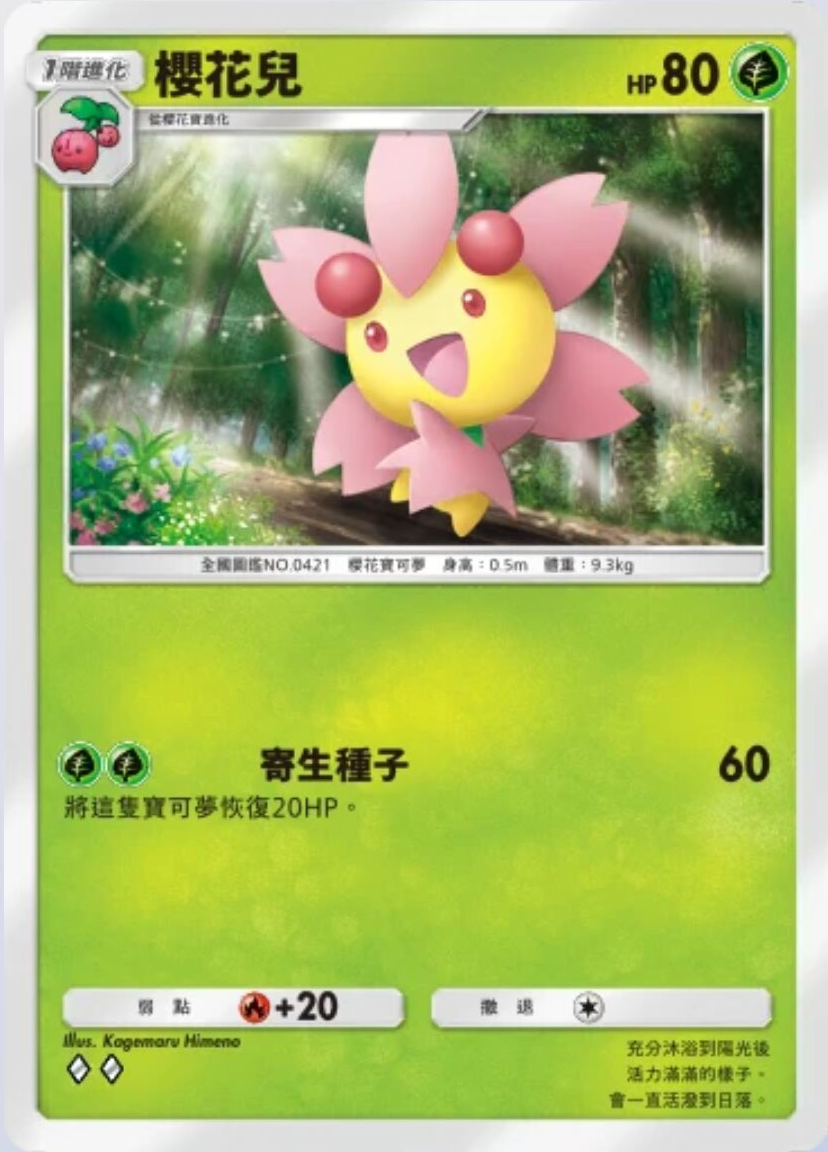 樱花儿 基础信息 樱花儿种类樱花宝可梦宝可梦1阶进化HP80属性撤退弱点 +20系列A绘师Kagemaru Himeno身高0.5m体重9.3kgA2a 008/75卡牌简介充分沐浴到阳光后活力满满的样子。会一直活泼到日落。 技能 寄生种子伤害:60将这只宝可梦恢复20HP,