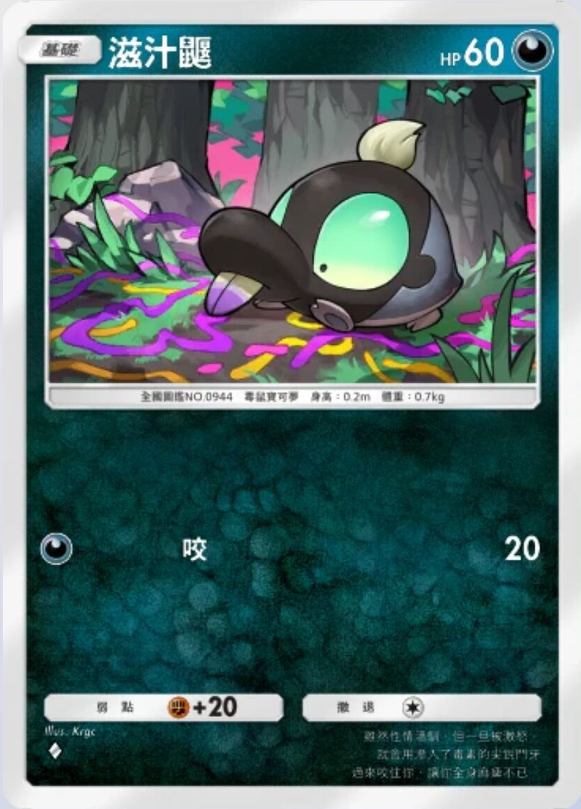 滋汁鼹 基础信息 滋汁鼹种类毒鼠宝可梦宝可梦基础HP70属性撤退弱点 +20系列A绘师Krgc身高0.2m体重0.7kgA2b 50/72卡牌简介虽然性情温驯,但一旦被激怒,就会用渗入了毒素的尖锐门牙过来咬住你,让你全身麻痹不已。 技能 咬伤害:20