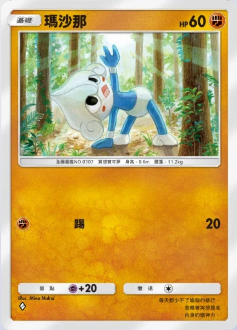 玛沙那 基础信息 玛沙那种类冥想宝可梦宝可梦基础HP60属性撤退弱点+20系列A绘师Mina Nakai身高0.6m体重11.2kgA2a 043/75卡牌简介每天都少不了瑜珈的修行。会藉着冥想提高自身的精神力。 技能 踢伤害:20