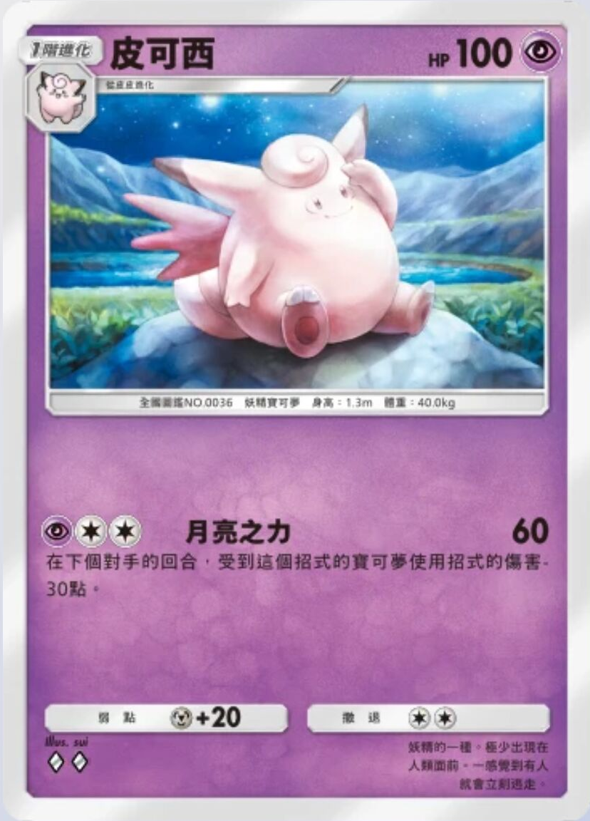 皮可西 基础信息 皮可西种类妖精宝可梦宝可梦1阶进化HP100属性撤退弱点 +20系列A绘师sui身高1.3m体重40.0kgA2a 030/75卡牌简介妖精的一种。极少出现在人类面前。一感觉到有人就会立刻逃走。 技能 月亮之力伤害:60在下个对手的回合,受到这个招式的宝可梦使用招式的伤害-30点。