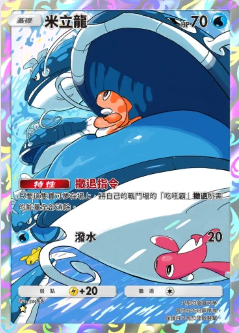 米立龙 基础信息 米立龙种类拟态宝可梦宝可梦基础HP70属性撤退弱点 +20系列A绘师cochi8i身高0.3m体重8.0kgA2b 75/72卡牌简介小型的龙宝可梦。会住在吃吼霸嘴里,保护自己免于外敌袭击。 技能 潜水伤害:20 特性 撤退指令只要这只宝可梦在场上,将自己的战斗场的「吃吼霸」撤退所需的能量全部消除。