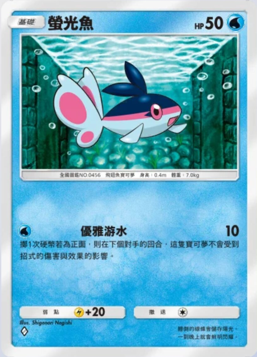 萤光鱼 基础信息 萤光鱼种类飞翅鱼宝可梦宝可梦基础HP50属性撤退弱点+20系列A绘师Shigenori Negishi身高0.4m体重7.0kgA2 042/155卡牌简介体侧的线条会储存阳光,一到晚上就会鲜明闪耀。 技能 优雅游水伤害:10掷1次硬币若为正面,则在下个对手的回合,这只宝可梦不会受到招式的伤害与效果的影响。