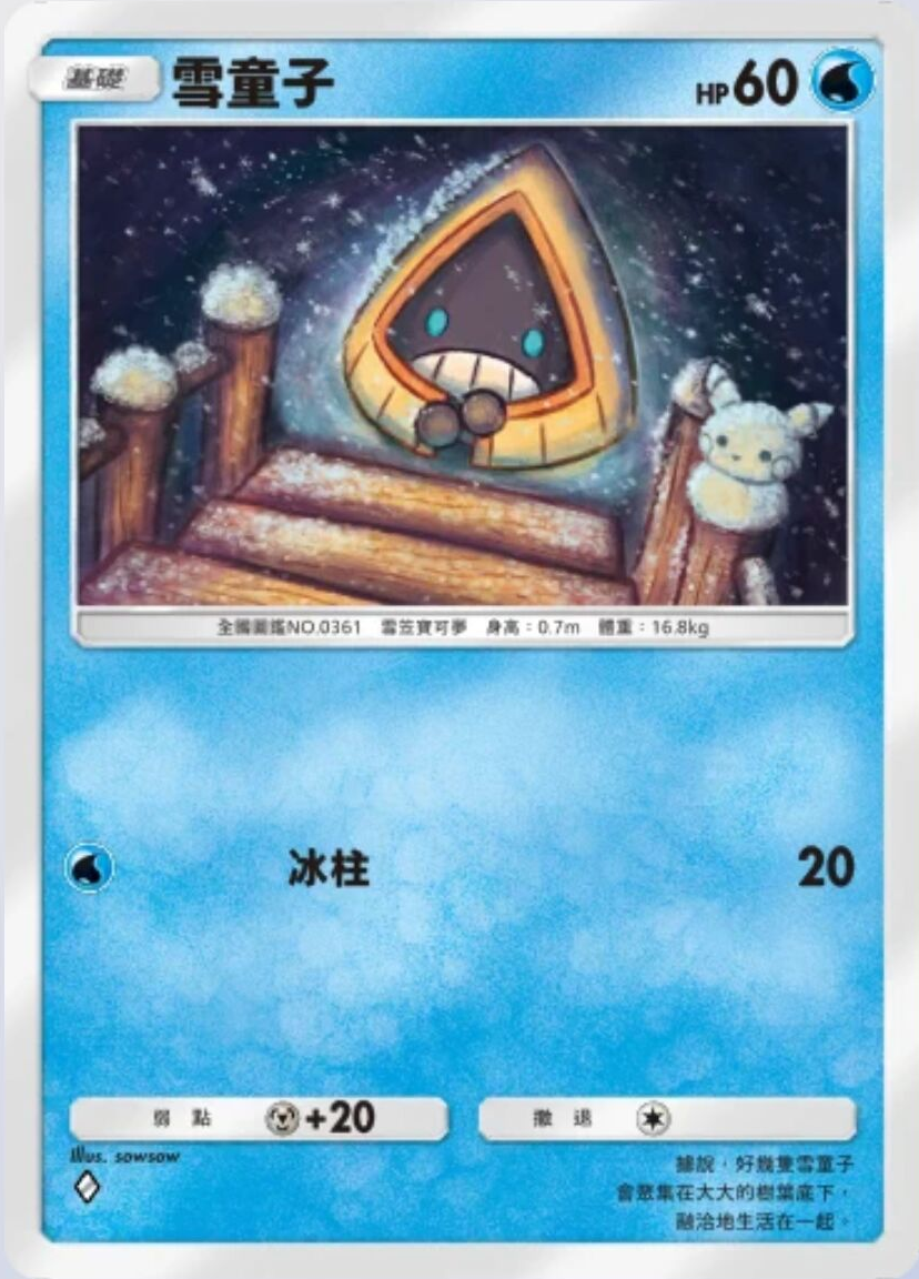 雪童子 基础信息 雪童子种类雪笠宝可梦宝可梦基础HP60属性撤退弱点 +20系列A绘师sowsow身高0.7m体重16.8gA2a 018/75卡牌简介据说,好几只雪童子会聚集在大大的树叶底下,融洽地生活在一起。 技能 冰柱伤害:20