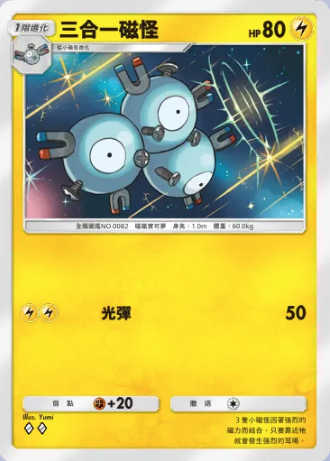 三合一磁怪 基础信息 三合一磁怪种类磁铁宝可梦宝可梦1阶进化HP80属性撤退弱点 +20系列A绘师Yumi身高1.0m体重60.0kgA2 052/155卡牌简介3只小磁怪因着强烈的磁力而结合。只要靠近它就会发生强烈的耳鸣。 技能 光弹伤害:10