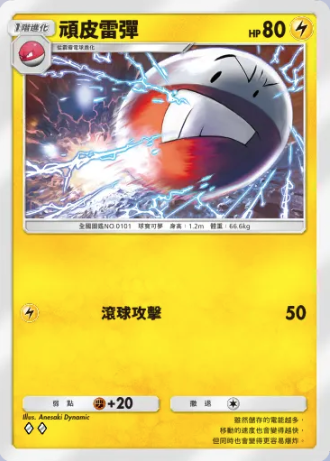 顽皮雷弹 基础信息 顽皮雷弹种类球宝可梦宝可梦1阶进化HP80属性撤退弱点 +20系列A绘师Anesaki Dynamic身高1.2m体重66.6kgA2 055/155卡牌简介虽然储存的电能越多,移动的速度也会变得越快,但同时也更容易爆炸。 技能 滚球攻击伤害:50