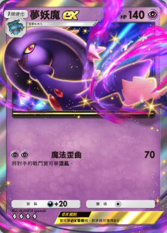 梦妖魔ex 基础信息 梦妖魔ex宝可梦1阶进化HP140属性撤退弱点 +20系列A绘师PLANETA IgarashA2 067/155 技能 魔法歪曲伤害:70将对手的战斗宝可梦混乱。