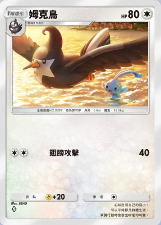 姆克鸟 基础信息 姆克鸟种类椋鸟宝可梦宝可梦1阶进化HP80属性撤退弱点+20系列A绘师REND身高0.6m体重15.5kgA2 133/155卡牌简介心知肚明自己的弱小,所以平时都是群体生活。单独行动时会发出吵闹的叫声。 技能 翅膀攻击伤害:40