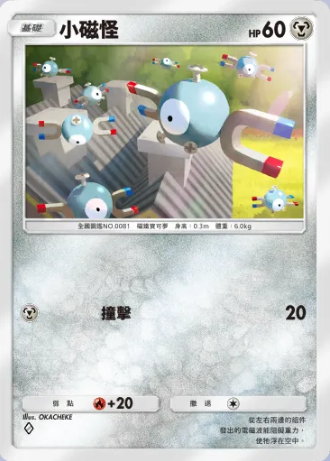 小磁怪 基础信息 小磁怪种类磁铁宝可梦宝可梦基础HP60属性撤退弱点 +20系列A绘师OKACHEKE身高0.3m体重6.0kgA2a 053/75卡牌简介从左右两边的组件发出的电磁波能阻碍重力,使它浮在空中。 技能 撞击伤害:20