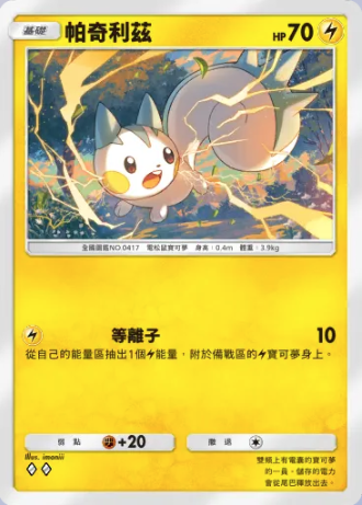 帕奇利兹 基础信息 帕奇利兹种类电松鼠宝可梦宝可梦基础HP70属性撤退弱点 +20系列A绘师Masakazu Fukuda身高0.4m体重3.9kgA2b 25/72卡牌简介双颊上有电囊的宝可梦的一员。储存的电力会从尾巴释放出去。 技能 等离子伤害:10从自己的能量区抽出1个属性能量,附于备战区的属性宝可梦身上。