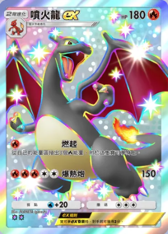 喷火龙ex 基础信息 喷火龙ex宝可梦2阶进化HP180属性撤退弱点+20系列A绘师PLANETA IgarashiA2b 108/72 技能 燃起从自己的能量区抽出3个属性能量,附于这只宝可梦身上。爆热炮伤害:150
